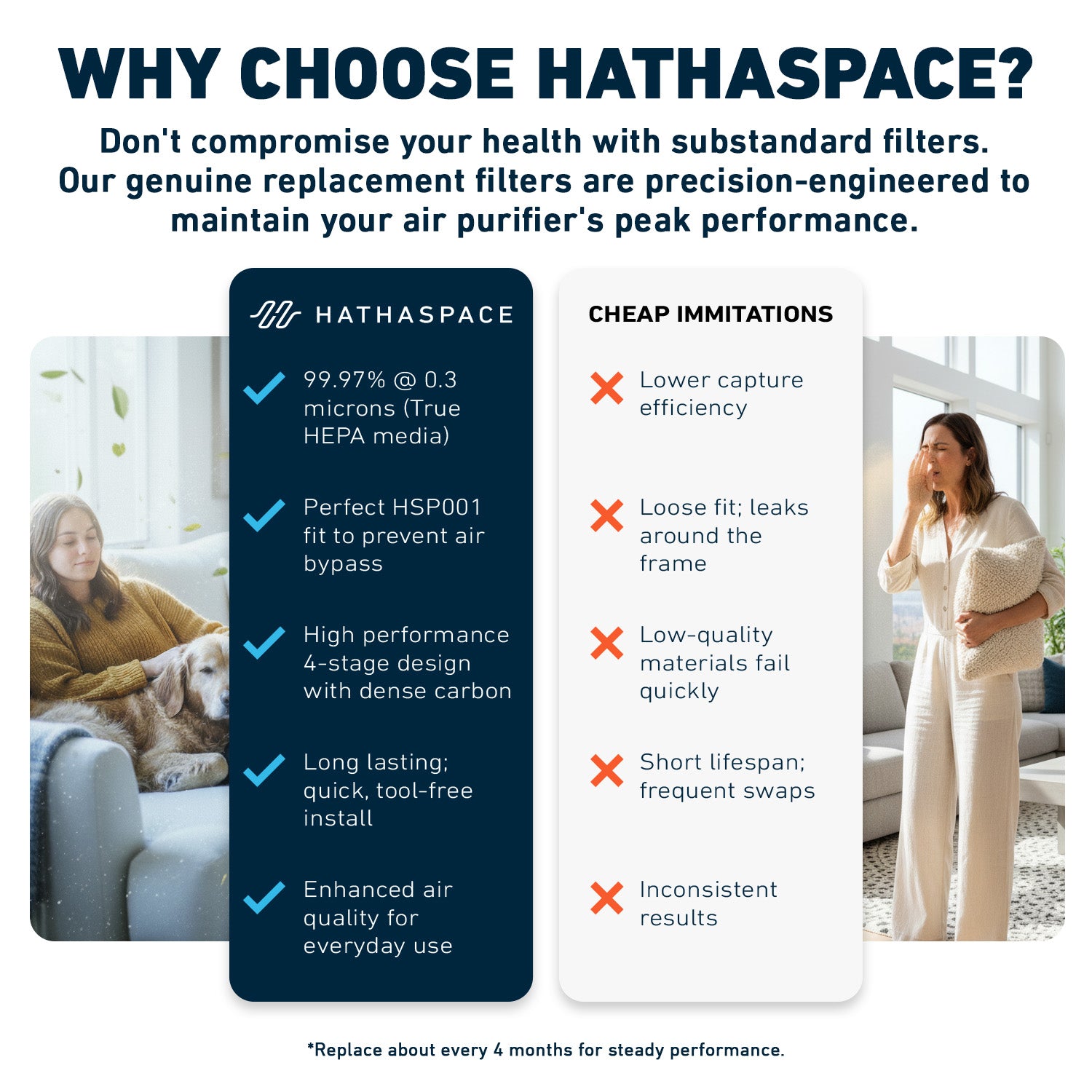 *Over 99.9% removal rate of Staphylococcus Albus & Escherichia Coli based on 3rd party testing (Intertek 2022)..Testing performed in appx. 128 sq. ft chamber over 60 minutes. Hathaspace does not make any claim that this air purifier removes SARS-CoV-2 from the air.
